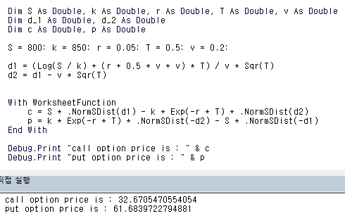 debug.print "call option price is : " & c
