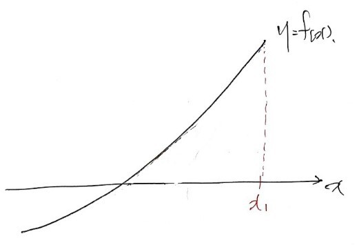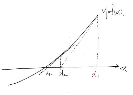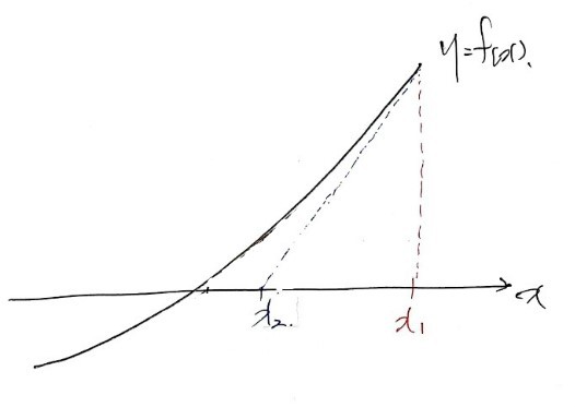 So from the point $(x_1, f(x_1))$, draw the tangent line. Take the x-intercept of that tangent line and call it $x_2$. Plug $x_2$ back into $f(x)$. Is $f(x_2)$ still ridiculously far from 0? Or are we getting close?