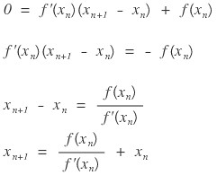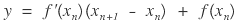 And $x_{n+1}$ is the $x$ where this tangent line hits $y = 0$. Set $y = 0$, solve for $x$, and: