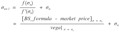 $$f(\sigma) = \text{BS\_formula}(\sigma) - \text{market price}$$We want $f(\sigma) = 0$. And the derivative we need for Newton-Raphson is $f'(\sigma)$: