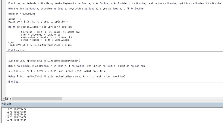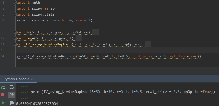 In the output you’ll see a bunch of implied volatility values โ that’s because I tried it with a bunch of different initial volatility values. They all converge to the same number.