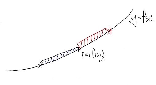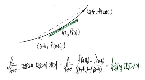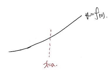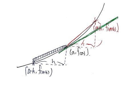 — the instantaneous slope at $x = a$ goes from the slope of the blue line (backward) to the slope of the red line (forward).