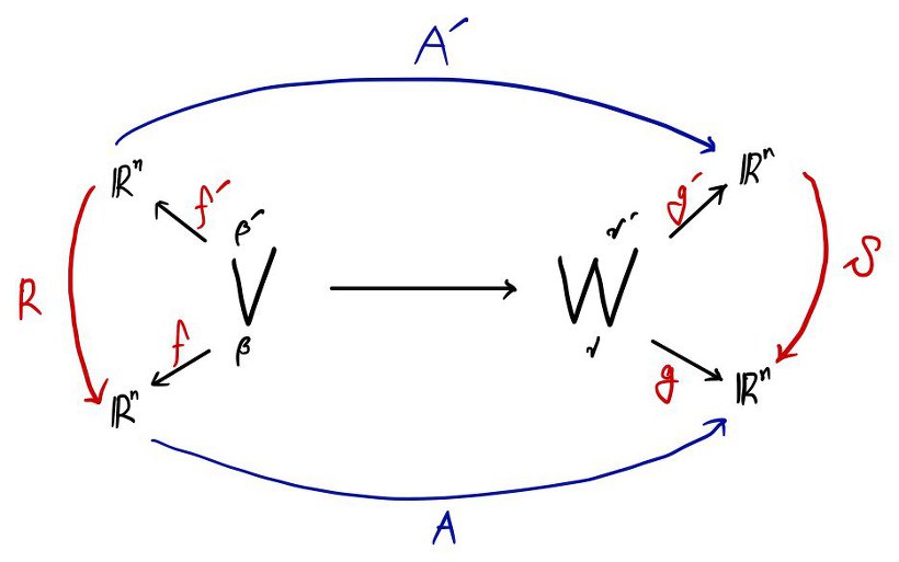 Inside V space, matrix R is doing a coordinate transformation between the β basis and the β’ basis. Same deal in W space — that’s what the picture is telling you. And we’ve got the function L connecting V and W, and the matrix representing it is either A or A'.