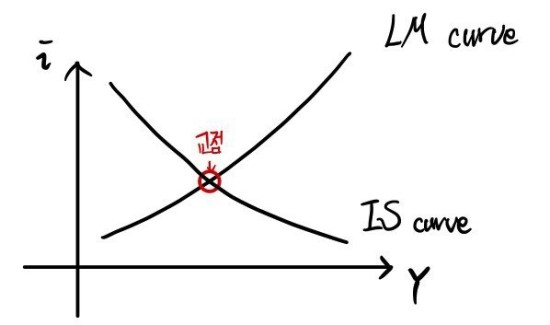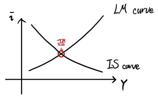 (The set of equilibrium points of the goods-market IS curve, the set of equilibrium points of the financial-market LM curve, their intersection is… the (Y, i) pair that satisfies goods-market equilibrium and financial-market equilibrium simultaneously, right.)