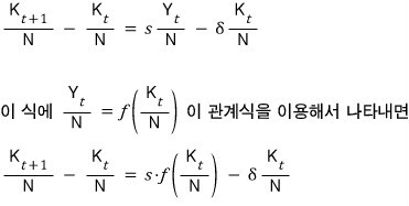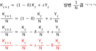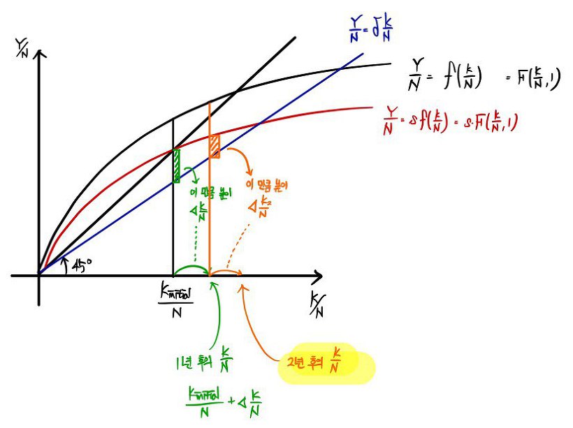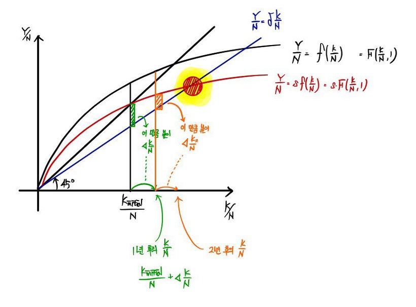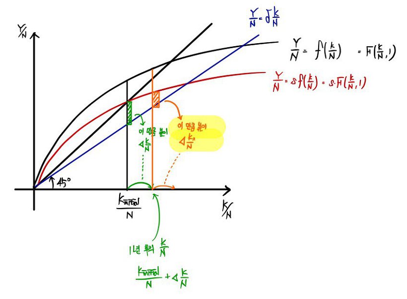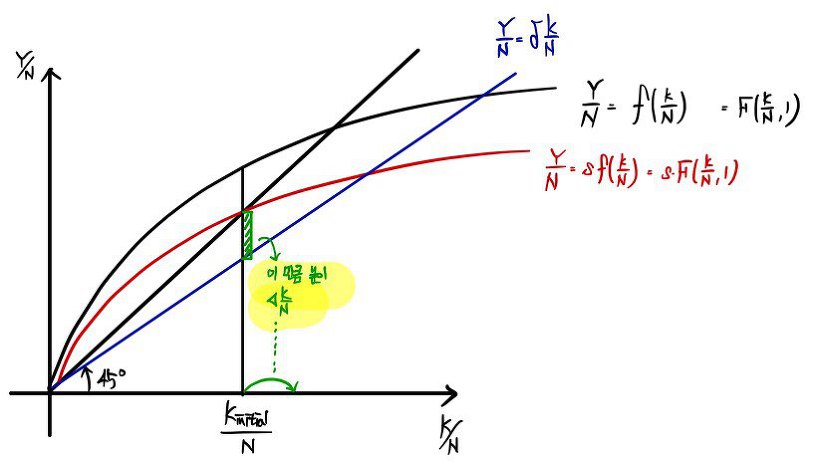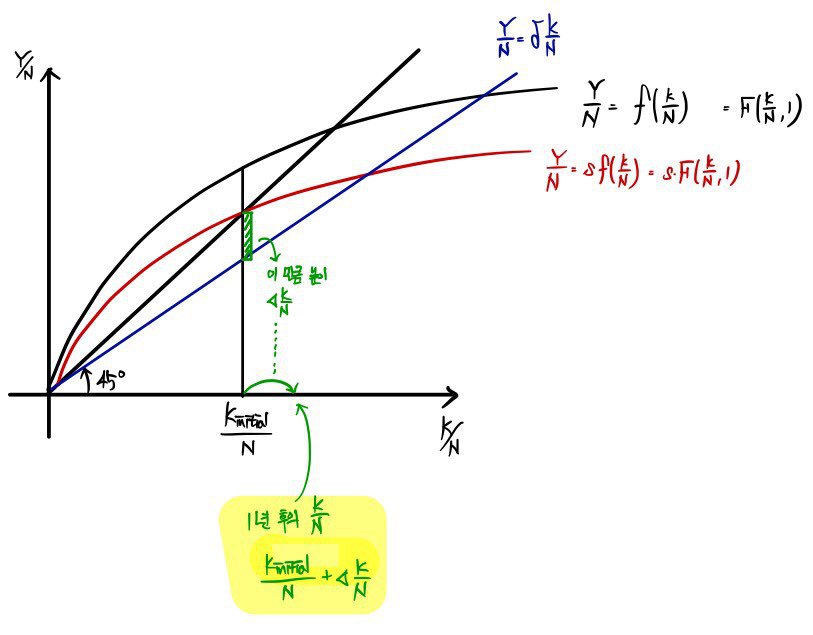 Meaning: capital per person in the following year ticks up from $K_{\text{initial}}/N$ by exactly that red-minus-blue gap.
