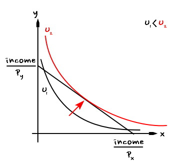 He buys the quantity combination of x and y given by the exact point where his utility function and his budget line are tangent~~~