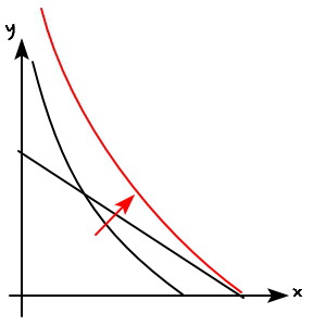 (The budget line has a bigger x-intercept than y-intercept, right? That means x is cheaper.)