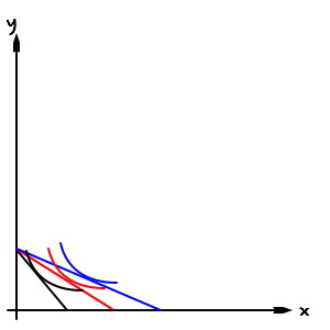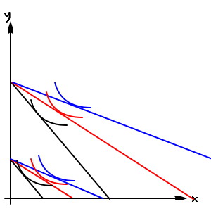 grows as good $x$ gets cheaper. (Because the slope flattens out.)