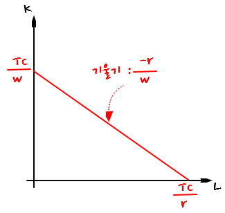 !!!” Then how much K and L should I use?@?@?@ Right now the wage rate is $w$, and the price of capital is $r$, so the isocost line gets pinned down like this@@