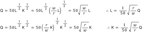 $$Q = 50L^{\frac{1}{2}}K^{\frac{1}{2}}$$First thing we want: as $Q$ goes up, what’s the minimum TC at each $Q$?