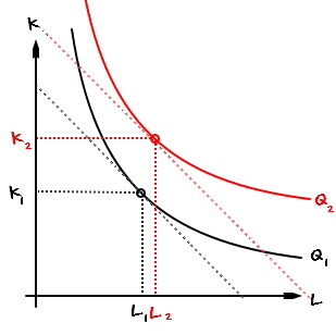 So producing $Q_{2}$ with $K_{1}$ burns more cost than the red dotted line.