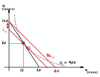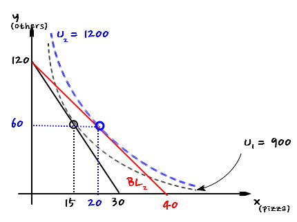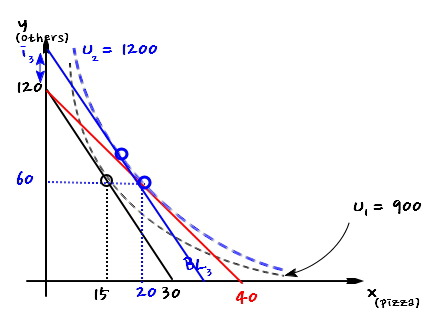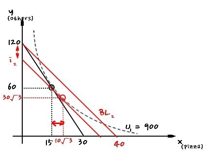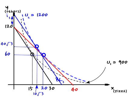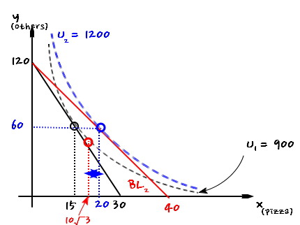 $$\Delta x = 10\sqrt{3} - 15$$and from there, the chunk that brought us up to $x = 20$ right now is exactly the income effect.