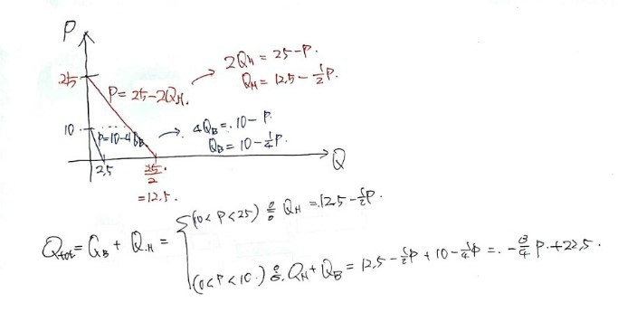 $$P = 10 - 4Q_{B}$$$$P = 25 - 2Q_{H}$$and obviously they don’t consume negative quantities.