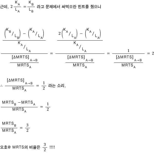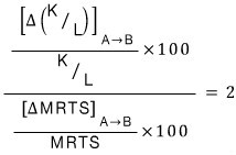 Points A and B sit on an isoquant curve, with labor on the horizontal axis and capital on the vertical. The capital-labor ratio at B is twice the one at A, and as you move from A to B the elasticity of substitution is 2. What’s the ratio of MRTS at A to MRTS at B?