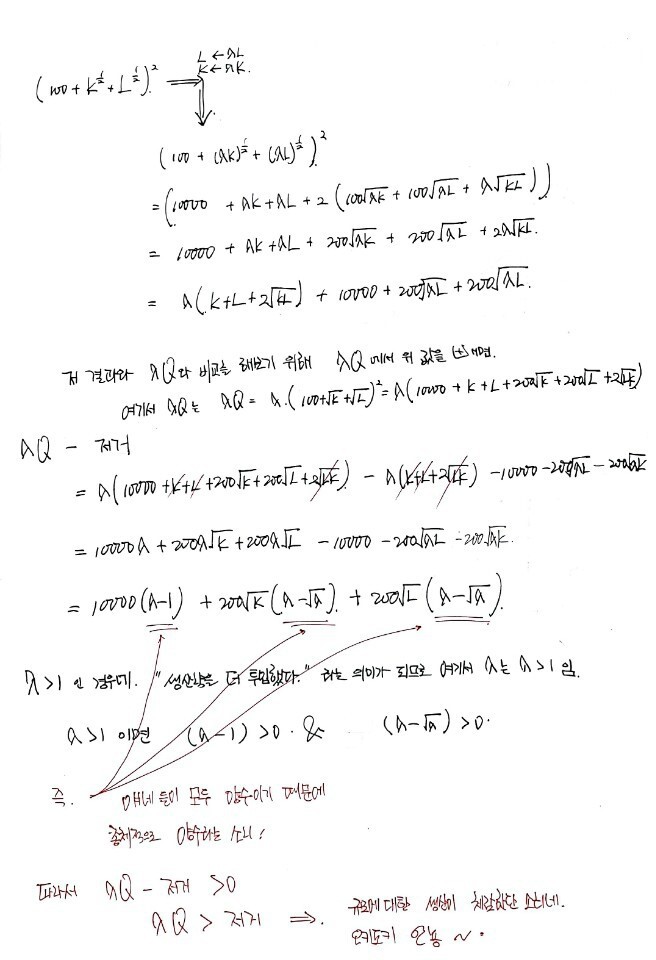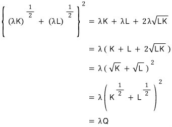 $$Q \quad = \quad \left( \quad 100 \quad + \quad K^{\frac{1}{2}} \quad + \quad L^{\frac{1}{2}} \right)^{2}$$Plug in $\lambda K$ and $\lambda L$ here!