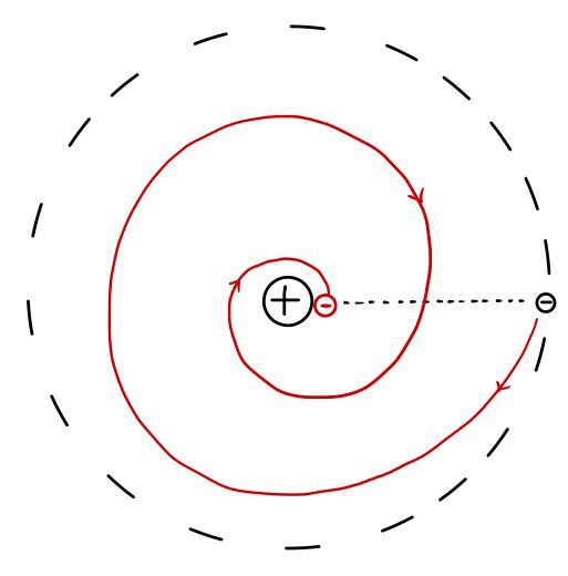 but once it starts spinning, electromagnetic waves are radiated, and so the electron, while rotating, drops energy bit by bit by bit