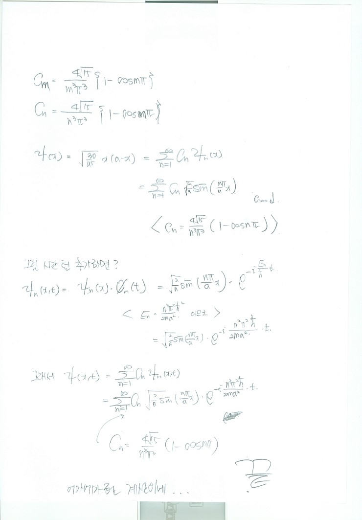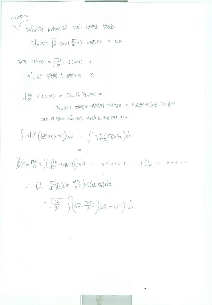 $$\int_{0}^{a}\psi_{m}^{*}(x)\psi(x)\,dx = \int_{0}^{a}\psi_{m}^{*}C_{1}\psi_{1}(x)\,dx + \int_{0}^{a}\psi_{m}^{*}C_{2}\psi_{2}(x)\,dx + \cdots \\ = 0+0+0+0+\cdots + \int_{0}^{a}\psi_{m}^{*}C_{m}\psi_{m}(x)\,dx + 0+0+\cdots \\ = C_{m} \\ \left(\int_{0}^{a}\psi_{m}^{*}\psi_{m}(x)\,dx = 1\right)$$O~~~~~~~~kay, so now we know how to dig out $C_n$ too!!!