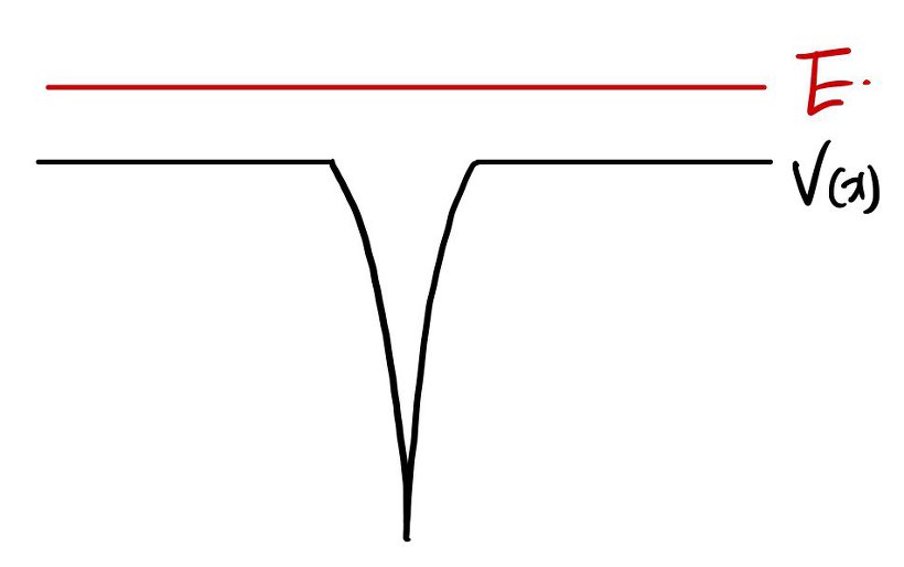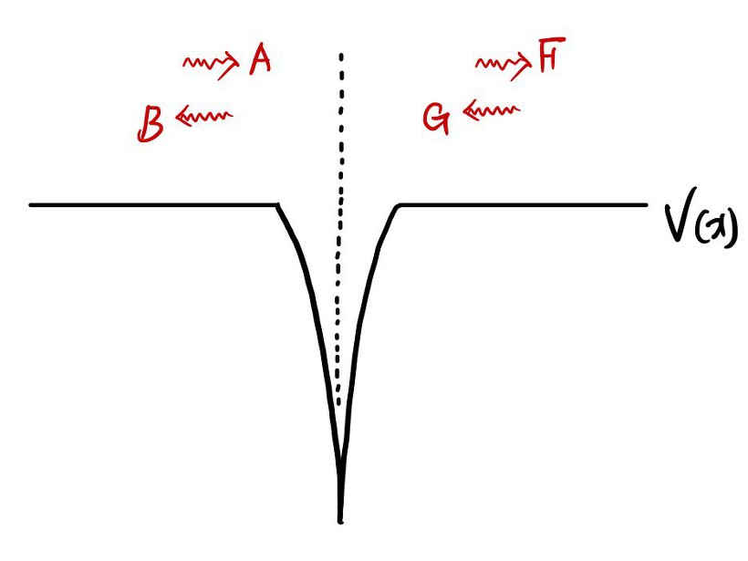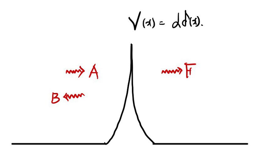 $$-\frac {\hbar^{2}}{2m}\frac {d^{2}\psi}{dx^{2}}\quad -\alpha \delta (x)\psi \quad =\quad E\psi \\ \int _{-\epsilon}^{\epsilon}{\quad}\frac {d^{2}\psi}{dx^{2}}dx\quad =\quad -\frac {2m\alpha}{\hbar^{2}}\int _{-\epsilon}^{\epsilon}{\quad}\delta (x)\psi dx\quad -\frac {2mE}{\hbar^{2}}\left( \int _{-\epsilon}^{\epsilon}{\quad}\psi dx \right) \\ \text{the red one}\quad :\quad \psi \text{ is continuous, so} \to 0$$$$\int _{-\epsilon}^{\epsilon}{\quad}\frac {d^{2}\psi}{dx^{2}}dx\quad =\quad -\frac {2m\alpha}{\hbar^{2}}\int _{-\epsilon}^{\epsilon}{\quad}\delta (x)\psi dx\\ \Delta \left( \frac {d\psi}{dx} \right) \quad =\quad -\frac {2m\alpha}{\hbar^{2}}\psi (0)$$$$\text{left side,}\\ \Delta \left( \frac {d\psi}{dx} \right) \quad =\quad \left| \frac {d\psi}{dx} \right|_{+\epsilon}\quad -\quad \left| \frac {d\psi}{dx} \right|_{-\epsilon}\quad =\quad ik(F-G-A+B)$$$$\text{right side,}\\ -\frac {2m\alpha}{\hbar^{2}}\psi (0)\quad =\quad -\frac {2m\alpha}{\hbar^{2}}\left( A+B \right) \quad =\quad \left( \text{or}\quad =\quad -\frac {2m\alpha}{\hbar^{2}}\left( F+G \right) \right)$$$$ik(F-G-A+B)\quad =\quad -\frac {2m\alpha}{\hbar^{2}}\left( A+B \right) \\ \text{let's line things up.} \\ ik(-A+B)\quad +\quad \frac {2m\alpha}{\hbar^{2}}(A+B)\quad =\quad -ik(F-G)\\ (A-B)\quad +i\frac {2m\alpha}{k\hbar^{2}}(A+B)\quad =\quad (F-G)\\ A\left( 1+i\frac {2m\alpha}{k\hbar^{2}} \right) \quad -B\left( 1-i\frac {2m\alpha}{k\hbar^{2}} \right) \quad =\quad F-G \\ \text{ugh!><}\quad \text{too}\quad \text{messy!!!!><} \\ A\left( 1+i2\beta \right) \quad -\quad B\left( 1-i2\beta \right) \quad =\quad F-G\quad \left( \beta \equiv \frac {2m\alpha}{k\hbar^{2}} \right)$$Two equations. That’s all we could squeeze out… T_T T_T T_T T_T T_T