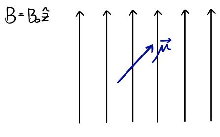 $$\overrightarrow{\tau} = \nabla\!\left(\overrightarrow{\mu} \cdot \overrightarrow{B}\right) \\ H(\text{hamiltonian}) = -\overrightarrow{\mu} \cdot \overrightarrow{B} = -\gamma \cdot \overrightarrow{S} \cdot \overrightarrow{B}$$OK, groundwork laid. All of that was just so we could talk about Larmor precession.