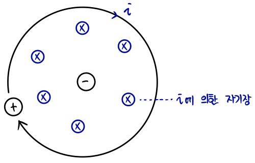 From the electron’s seat, we can draw a picture like this: proton going around → current → magnetic field, plus the electron’s own spin sitting in that field.