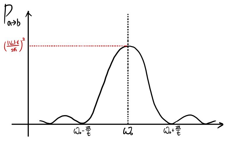 $$\therefore \quad C_b(t) = -\frac{V_{ba}}{2\hbar} \left( \frac{e^{i(w_0-w)t} - 1}{w_0-w} \right) = -\frac{V_{ba}}{2\hbar} \left( \frac{e^{i(w_0-w)t} - 1}{w_0-w} \right) \frac{e^{-i(w_0-w)\frac{t}{2}}}{e^{-i(w_0-w)\frac{t}{2}}} \\ = -\frac{V_{ba}}{2\hbar} \left( \frac{e^{i(w_0-w)\frac{t}{2}} - e^{-i(w_0-w)\frac{t}{2}}}{(w_0-w)\, e^{i(w_0-w)\frac{t}{2}}} \right) = -\frac{V_{ba}}{2\hbar(w_0-w)} e^{-i\frac{(w_0-w)}{2}t} \left( \frac{e^{i(w_0-w)\frac{t}{2}} - e^{-i(w_0-w)\frac{t}{2}}}{1} \right) \\ = -\frac{V_{ba}}{2\hbar(w_0-w)} e^{-i\frac{(w_0-w)}{2}t} \left( \frac{e^{i(w_0-w)\frac{t}{2}} - e^{-i(w_0-w)\frac{t}{2}}}{2i} \right) 2i \\ = -\frac{2iV_{ba}}{2\hbar(w_0-w)} e^{-i\frac{(w_0-w)}{2}t} \sin\!\left(\frac{w_0-w}{2}t\right) \\ = \frac{V_{ba}}{i\hbar(w_0-w)} e^{-i\frac{(w_0-w)}{2}t} \sin\!\left(\frac{w_0-w}{2}t\right)$$This thing — this right here — $|C_b(t)|^2$ is the probability of finding the system in state $b$ after $t$ seconds!!!