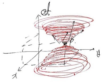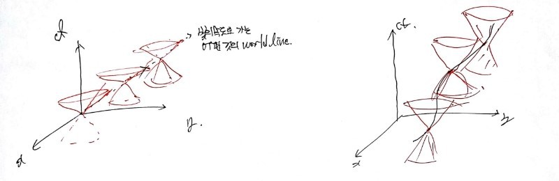 (Sorry that the cone in the picture is drawn roughly.. I drew the ’light cone’ at each point. I’ll call the left picture (a) and the right picture (b))