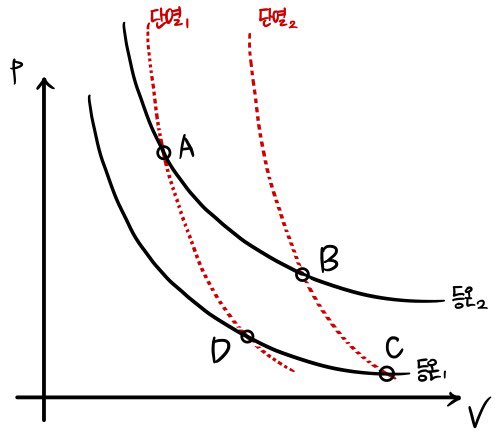 The reason it’s called isothermal ’expansion’ is, looking at the x-axis, the x-axis is V, and the A→B process is one where V gets bigger, so it’s called isothermal expansion!