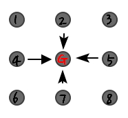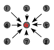 For an actual material, particle G would be influenced by multiple particles 1, 2, 3, 4, 5, 6, 7, 8.